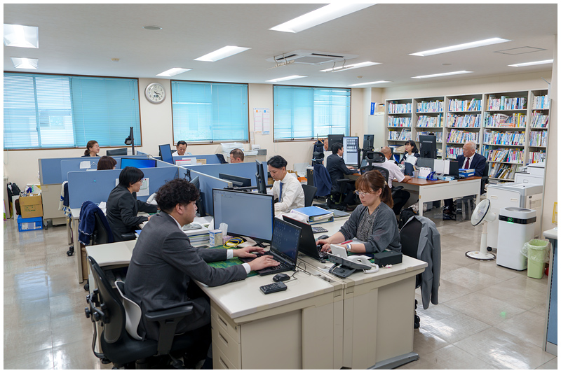広くて明るいスペースで、スタッフが普段の業務を行っています。